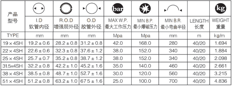內(nèi)膠層:耐油合成橡膠 加強層:4層高抗拉鋼絲纏繞層 外膠層:耐天候,耐臭氧的合成橡膠 工作溫度:-40℃~+100℃